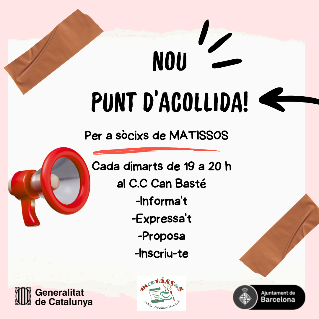 Matissos obre les seves portes amb el Punt d’Acollida, un espai de trobada pensat per acompanyar, escoltar i orientar tant les persones sòcies com aquelles que s’apropen per primera vegada a l’entitat. Un espai obert on pots venir a conèixer Matissos, compartir inquietuds, expressar-te i participar activament en la vida col·lectiva de l’associació.